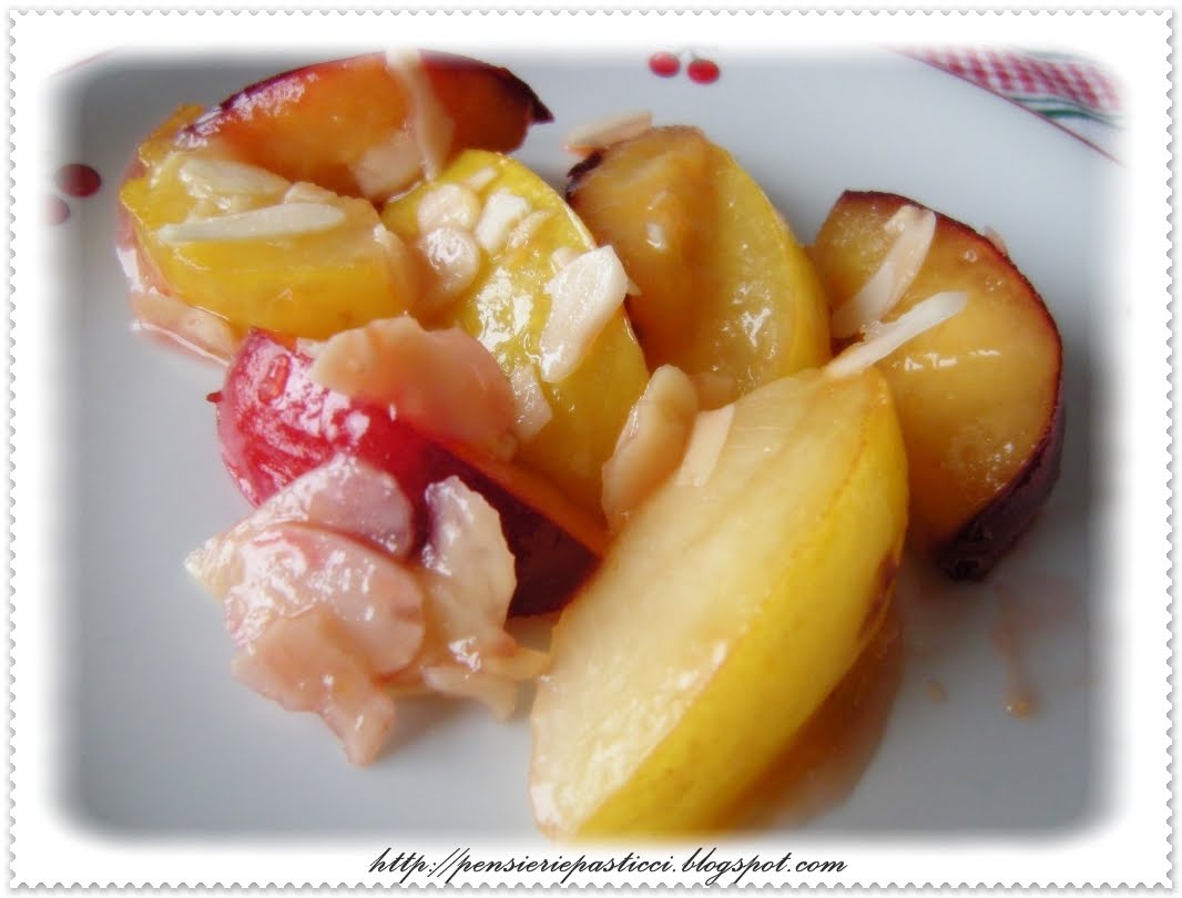 Ho poi spolverizzato il tutto con delle mandorle a lamelle, fatto saltate ancora un ‘altro pò, spento la fiamma e servito..questa volta così, senza nessun accompagnamento (ma come al solito panna o gelato ci stanno che è una meraviglia!)