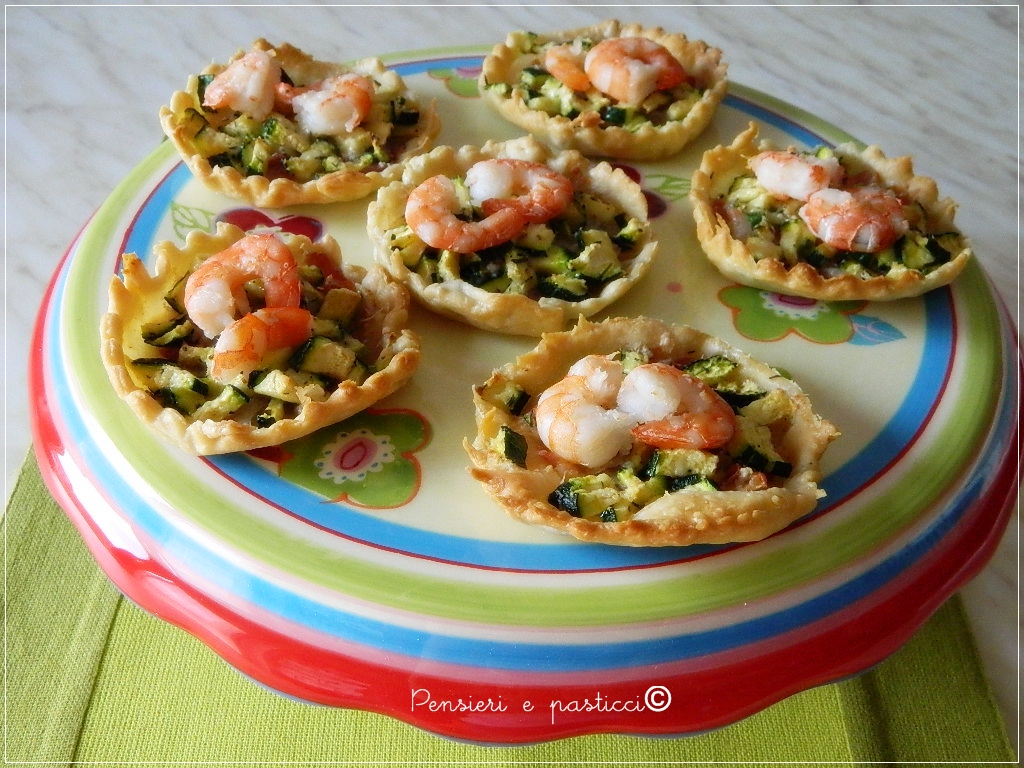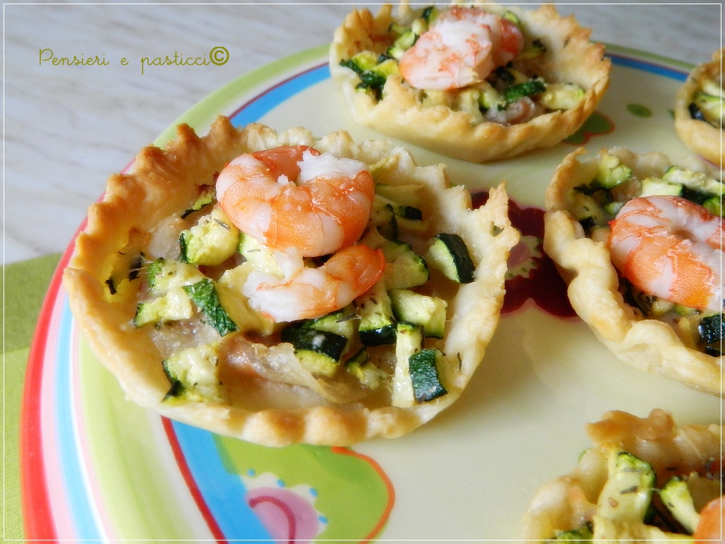 Mettete al centro delle crostatine le fette di pancetta tagliate in misura, lasciando libero il bordo, unite le zucchine preparate, finite la decorazione in superficie con qualche coda di gambero e cuocetele a 220° per circa 10 minuti, finchè risulteranno ben gonfie e dorate.