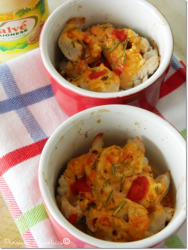Con un pennello in silicone ed un goccio d’olio ho spennellato l’interno delle cocottine, ci ho versato gli straccetti ed ho irrorato con la cremina di maionese preparata…sopra ho aggiunto qualche aghetto di rosmarino spezzettato a mano e qualche pezzettino di pomodoro.